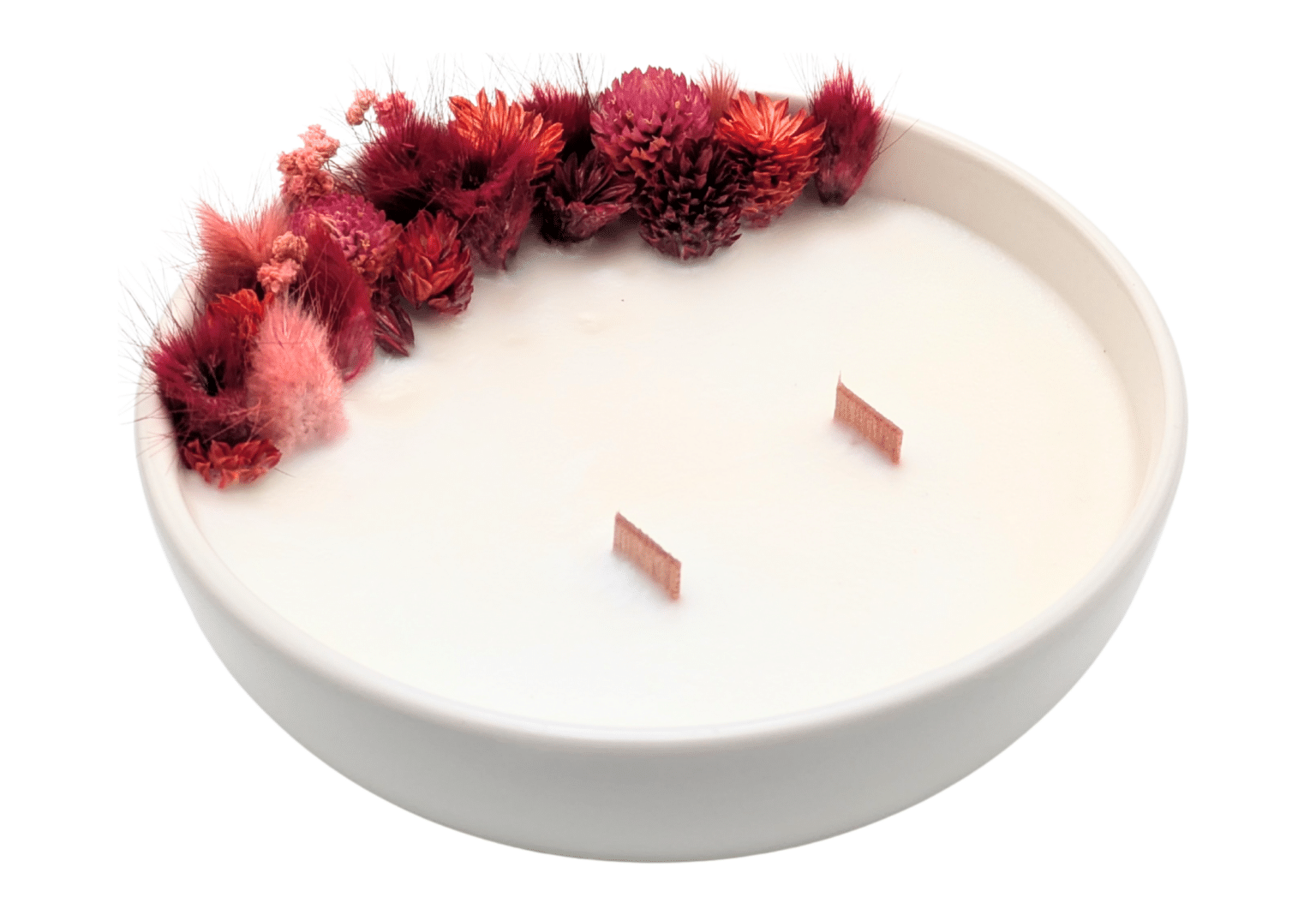 Les mèches sont volontairement décentrées afin de préserver les fleurs séchées et de garder la bougie esthétique jusqu’à la dernière lueur. Toute la cire ne se consumera pas entièrement : c’est un choix assumé, pour que votre bougie reste jolie le plus longtemps possible.